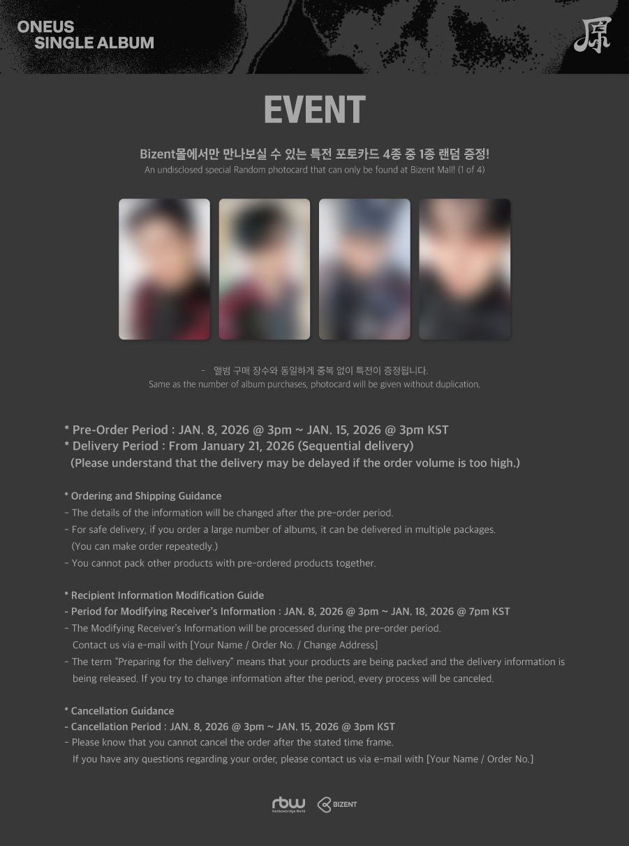 5. 赠品(海报、照片卡、特展等)的细微刮痕及褶皱等不属于更换或退款对象,严重破损时仅限库存进行更换或接收。 库存耗尽的情况很难再发送,敬请谅解。